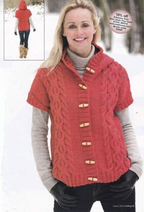 This is a pattern for Medallion Cable Jacket, originally published I Knitting magazine. It has a cable pattern, with a hood and short sleeves. Photo Laurel Guilfoyle for Knitting magazine.