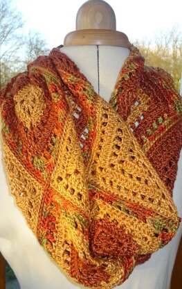 I love the colours and atmosphere of souks and medinas in Morocco and Turkey, most of all I love the earthy natural colours of the textiles and carpets. This design is inspired by the shapes and colours of those carpets, a long cowl which you can wrap twice (or thrice) round for warmth, or once for cool. Originally designed for Willow Knits hand-dyed Silk Worsted, any dk/worsted weight yarn with a high silk content will work well - ideally 2 solid colours and 1 variegated.
