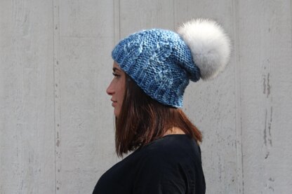 Mega Clear Water has a simple cable pattern all the way around. Knit entirely in the round, brim up and seamless, this is a fast knit and only takes a few hours to make. The fur pom can be found in the Etsy shop: Wabarna