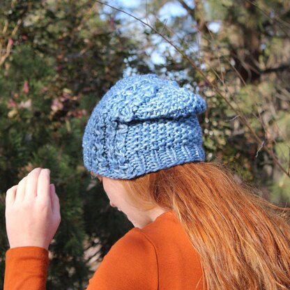 Mega Hug and Kiss has pretty textured pattern. Knit entirely in the round, you can have this done in an evening. This is designed for super bulky yarn, but you can double bulky, or use 4 strands of worsted or aran yarn.