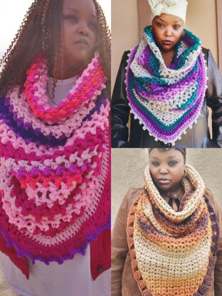 A mega triangle scarf just in time for those chilly days & cold nights. This scarf is worked flat in a triangle shape, and then joined in the round to form the cowl. Crochet this piece in a solid color or use a variegated yarn like Red Heart stripes or Caron cakes to give this scarf just the right amount of color & pizzazz. The possibilities are endless.