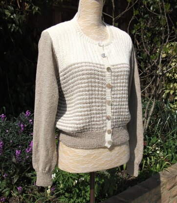 A charming cardigan with a vintage feel, worked in 2 subtle contrast shades in a light-weight yarn. The body is easy fitting with a closer-fit ribbed lower edge, giving a slightly blouson fit to match the sleeves. The patterning consists of an easy 4 row repeat. A super wearable little number.