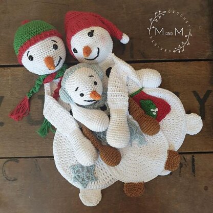 What you will crochet: A snowman family with lightly stuffed heads, hands and feet and a flat body. A cross between a soft toy and a lovey blanket. The pattern includes instructions for dad, mom and little Chilly.