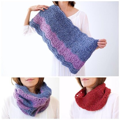 Coalescing a light, soft bulky weight yarn with beautiful textured lace, the Melody cowl promises a euphoric easy knit of its deceptively intricate stitch pattern. The instructions offer 3 fetching sizes — a sweet neckwarmer in a single color, a chic tall cowl with bold jaunty stripes, and a versatile loop scarf with an accent color band — all knit up quickly and are cozy to wear. Melody, scaleable both in height and circumference, invites fun colorplay and creative customization alike.