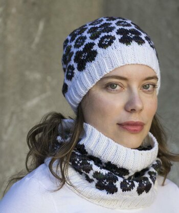 Materials: 180 yds/ 162 m (hat) and 250 yds/ 225 m (cowl) of worsted weight yarn