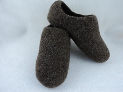 The slippers are knitted in the round as well as straight knitting and uses 100% wool worsted weight yarn, basic knit stitches, 29” circular needles or double pointed size US 11. Skill level, easy to moderate, short row knitting involved. Machine washing for felting technique.