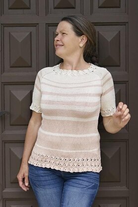 Zwei Farben wechseln sich in einem harmonischen Reigen (Menuett) miteinander ab. Es wird in Runden nahtlos von oben gestrickt, den etwas tieferen (vorderen) Halsausschnitt formen verkürzte Reihen. Der Pullover kann figurbetont (Originalmodell) oder mit A-Linie den eigenen Vorlieben entsprechend gearbeitet werden.
