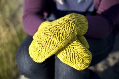Meristem features a botanical motif of sprouting leaves. The mittens begin with a ribbed cuff worked in the round that transitions into the Meristem pattern at the back of the hand, while continuing in ribbing on the inner wrist for a more comfortable fit. The palm of the hand is worked in stockinette stitch and a gusset is used to create extra fabric for the thumb specifically for right and left hands. The botanical motif continues to the tip of the fingers, where the stitches are decreased and grafted together to form a rounded mitten top.
