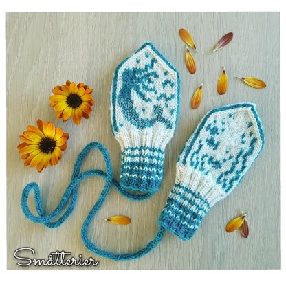 These are thumbless baby mittens, knitted in two colours in the round. Details are embroidered using duplicate stitch after the mitten is done.