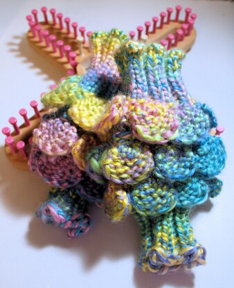 This is a cute pattern that can easily be adjusted in size for child to adult. The original video is done for a child but instructions offer how to make it an adult pattern. I used the universal small x loom in 5/8" gauge but a flexee loom in same gauge will work as well. I also offer instruction for a 24 peg round loom in same gauge for those who want to make this pattern with minimal changes. The special part of this pattern in the crocodile stitch on the loom. It is worked in and not done separate. The video tutorial will help greatly for this pattern. I would suggest if you use the Yarn Bee Colorplay that you get at least 3 to 4 skeins as this pattern eats a lot for the crocodile stitch. 3 if you are making a child set, and 4 if you are making an adult set. This is what I would consider a intermediate advanced pattern, if you want to challenge yourself a video is included that can help. Always if you have any questions feel free to ask me.