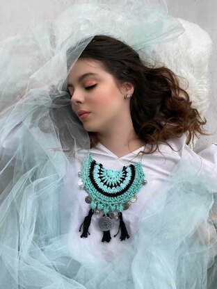 This design was made following the request of Homespun Crochet Magazine (summer 2022). The Mermaid Dreamcatcher is an eye-catching bohemian bib necklace, embodying free-spiritedness. It is worked in rows, using basic crochet stitches that will yield a fantastic final look. Left-over yarn is perfect for this project. The pattern comes in both UK and US crochet terms. Yarn, colors, qty: Phildar Coton 3 (100% cotton, 121m, 50g, Australian 5 ply equiv.) in the following colours. Colour 1: Opaline #2151, 10g Colour 2: Noir #1200, 5g Colour 3: Jade #1380, 10g Hook: 3mm Other tools/supplies/notions • Tapestry needle for weaving ends • 45cm long chain • Fifteen jump rings • Jewellery trinkets for decorative purposes, eg: o Six metal beads o Six small metal coins o One big metal coin o Three black fringes