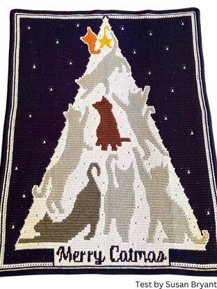 Thoroughly enjoy the festive charm of the holiday season with this overlay mosaic crochet pattern featuring an evergreen adorned with adorable cats. Each layer of the tree features playful felines mischievously playing amongst the branches. The highlight? A curious cat peeking from behind the tree's pinnacle, joyfully batting at a shining star that dangles from a swishing tail. Let us not neglect the adorable little cat paw snowflakes softly falling all around! Perfect for cat lovers and holiday enthusiasts alike, this pattern brings a touch of warmth and cheer, making it an ideal project for creating a unique and heartwarming centerpiece.