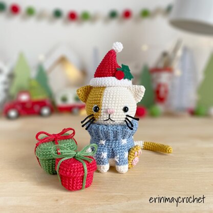Learn how to crochet your own Merry Little Cat with this detailed PDF pattern. The pattern includes step-by-step instructions with photos to crochet the cat and two presents pictured in the listing.
