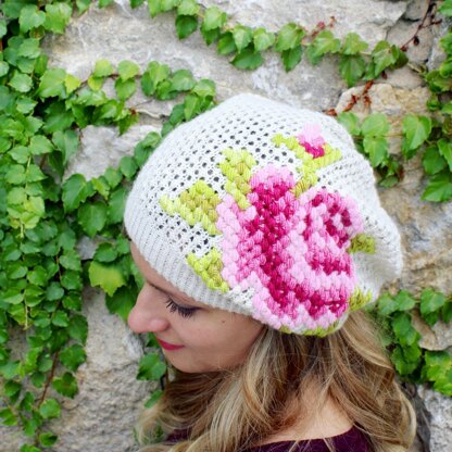 This accessory will be a perfect addition to your wardrobe for the new season! The hat is created in a luxurious Merino/Silk blend in fingering weight yarn with twisted ribbing at the bottom along with a cleaver mesh pattern with cross-stitch embroidery at the top. The embroidery is worked over a mesh pattern section after the hat is knitted.