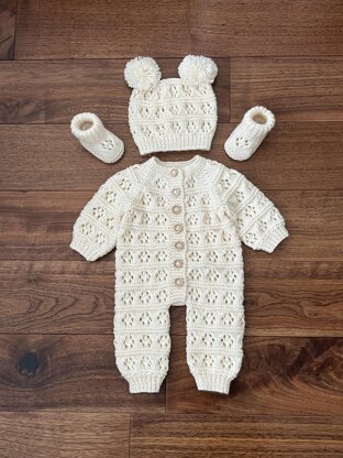 A beautiful 3 piece Romper set knitted with a simple eyelet stitch .