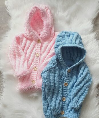 Size Guide: The pattern for a Hooded Jacket and has instructions to fit 16″, 18″, 20″ and 22″ chest and the end product is larger as it is a jacket. This is a chunky knit pattern and will fit 0-2 Year Olds.