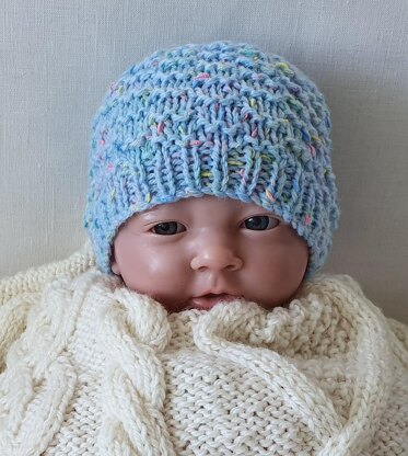 This 8ply Beanie has a 1x1 rib brim then is worked in an easy textured stitch. This design will suit either a baby girl or boy and the pattern includes three prem sizes and a newborn size.