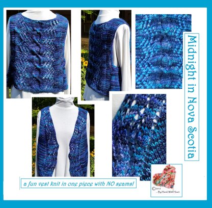 This is a really fun knit with its unique construction, lacy back and fronts that can be worn open or closed with a shawl pin. This one starts at the back hem: a lovely cable and lace panel that will be the same for all, regardless of size. Once the panel is done, shoulders are created, shoulders that are half on the back and half on the front; you’ll finish up the vest with the fronts (working from the top down), creating a lovely scalloped edge for the vest.
