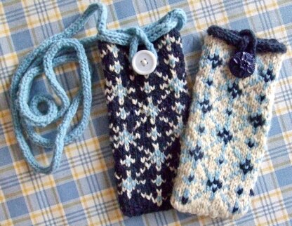 About The Design: Whether you call it an iCozy, iSleeve, iSock, or iCover, this pattern is the 2nd in a series of knit covers for your cell phone or eyeglasses. Cell phones are ubiquitous, so, with a small investment of time, you can knit yourself, family, and friends a colorful i-cover! The covers only weigh about an ounce, so they make good use of all those tiny balls of stash yarns we can’t bear to get rid of. This cover will bring the delight of a winter night’s snowfall into your home to enjoy, even if you too don’t get to see snow! This drama is enhanced by a third color duplicate stitched on afterwards, which makes the snowflakes twinkle! There is also a light color background option.
