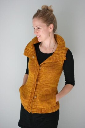 Mielie (South African maize) is simple, classic, and utterly wearable in a number of ways. This vest is knit in Stockinette Stitch from the top down, mostly in one piece, with waist shaping. A ribbed collar is added once the body is complete, and is folded and sewn down for a thicker, warmer, and more dramatic shape. Mielie can be worn all snapped up, barely fastened with the collar falling open, or all open for a more relaxed look – the use of snaps allows you to choose the best placement after trying the finished vest on. And no fall piece is complete with out pockets – knit them straight onto the body (or simply leave them off if your hands are warm enough already).