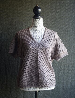 Can you ever have enough linen in your closet? This lovely linen-cotton blend boasts great stitch definition and lovely drape for this modern short-sleeved top. A knit cotton-linen piece has the advantage of getting better the more you wear it—wearing and washing softens the fibres. This top is worked in two flat pieces, is seamed together, and then the short sleeves and bottom hem are worked in the round. The lacy pattern is striking, yet easy to remember so it’s not too taxing on the brain (you can still watch TV while making this piece once you get into the rhythm of it!).