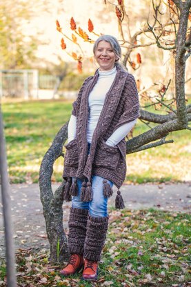 This textured pocket shawl makes me think of a forest… I can hear the sound of leaves crunching under my feet… Winter is coming and the perfect combination of puffs and posts will keep you warm and loved. It creates a beautiful crochet set with the Mila Coco Leg Warmers.