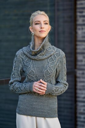 Named after the sophisticated city of Milan in Italy, is this pullover with a high rib, creating a narrower waist. Two center cables travel towards the shoulder on the body with all their texture; Seed stitch, twisted stitch rib and cables. While a narrower matching cable adorn the sleeve with a panel of seed stitch. Milana is knitted in pieces for the ultimate fit and ends in a crew neck. A separate cowl can be worn as a crowning collar. The hand dyed DK – Merino/Silk/Yak yarn from Norne Yarn makes the cables pop and the texture shine in all its glory.