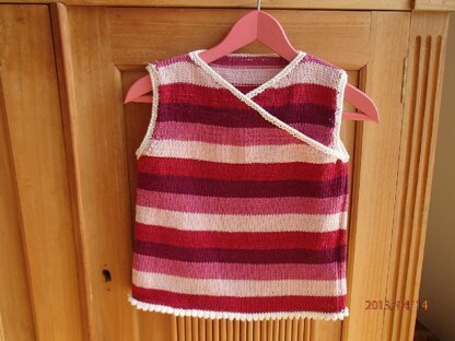 The top is as easy as fun to make. The knitting would suit an advanced beginner as well as a more experienced one. There are no difficult stiches involved. Maybe the most difficult part will be to choose colors for the stripe-pattern? The top is worked in the round, and bottom up to armpits from where work is divided for back and fronts. The right fronts stiches are picked up over the left front - easily done when you have a stripe-pattern to follow! Stiches are picked up along the armholes and the cross-over fronts to make the simple and lovely garter stich borders.