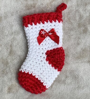 Ideal stocking filler or tree ornament. Finished size is approx 4ins tall with enough space to tuck in some chocolate treats before you hang it on the tree. Worked in the round, with colours and embellishments your choice. Ideal for using up ends of skeins.