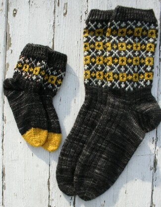 Yarn: Sock yarn in 3 colors, sample is worked with Frida Fuchs Remmidemmi, col. Vanilleschote, and Mominoki sock yarn, col. Antique Ivory and Safran.