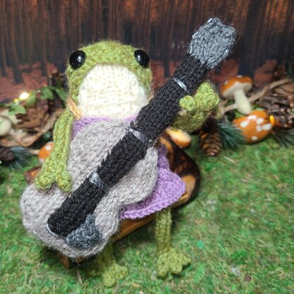 I made this guitar as part of my Taylor Swift inspired outfits. It's knit from the bottom up, in the round, with a few details knitted separately and sewn on or embroidered. The gauge is meant to fit alongside my dotpebbles frog/ animal dolls, but could be made larger or smaller using different weight yarn and needles