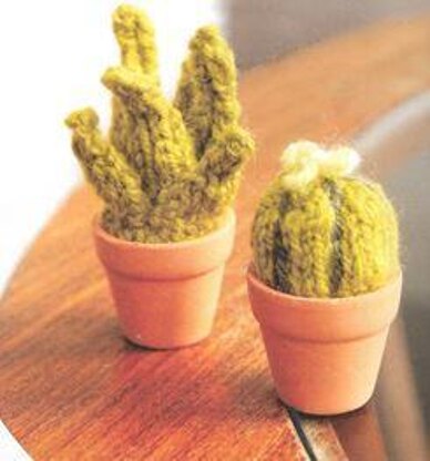 This is a pattern for two mini plants in pots, originally published in Knitting magazine. the first is a cactus plant, the second a succulent, made up of separate leaves around a base. Both are in small shop bought terracotta pots. The cactus has added embroidery. You will also need toy stuffing. Main photo Knitting magazine.