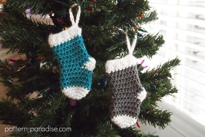 These cute little stockings are great tree ornaments, gift tags or just simply as hanging ornaments. They are easy and fun to make and look festive in a yarn with a little sparkle.