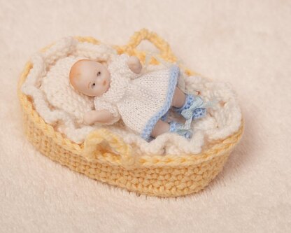 This gorgeous little dress and booties set is ideal for a 1/12th scale dolls house baby. I have knitted it also with the crocheted basket (available separately) as a welcome gift/keepsake for a new baby with the baby's details printed out and included.