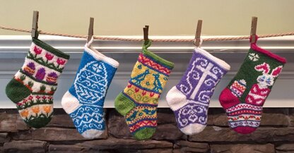 We again return to the world of miniature stockings. However, this time we are celebrating Spring with five new designs - a lovely garden where someone hid some eggs, a fancy decorated egg, some country blue birds, a lovely cross and a cute bunny with his favorite egg.