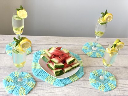 The set is worked using Tunisian crochet technique and consists of four coasters and four placemats.