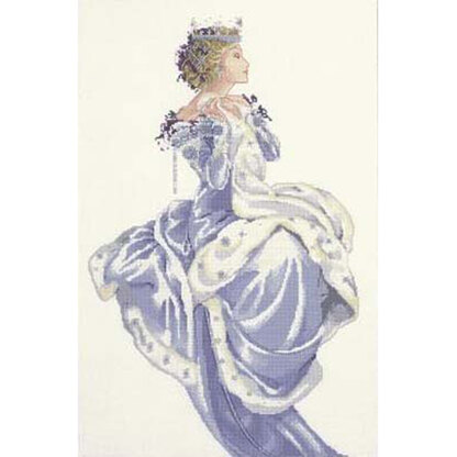 Regal in pale periwinkle blue satin against a serene white background, this cool beauty's upswept hair is adorned with purple violets beneath a beaded coronet. Whisper-white ermine trims her elegantly draped gown, and strands of blue beads lend an opulent touch to her hem.