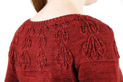 The cardigan is worked in one piece from the top down with a leaf lace pattern on the round yoke. Short-row shaping is used to add length to the back yoke. Waist and back shaping give this hip length cardigan a flattering hourglass shape.