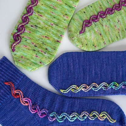These socks, featuring a vertically stranded cable pattern and a smooth hybrid mini-gusset/short-row heel, were inspired by the swirl of smoke that drifts upward after a candle is blown out.