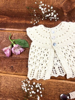 Miss Penelope Light has a vintage feel to it and will become an heirloom piece to be handed down from baby to baby. Top down construction, with a 3 or 4 button closer. This is designed with positive ease, so there will be room to growinto a tunic. Suitable for Fingering or Sock.