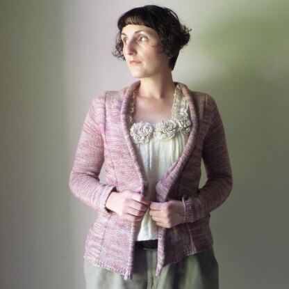 This open-front cardigan is worked from the top-down in one piece with raglan shaping at the shoulders, and waist shaping at the back. It begins with a provisionally cast on shawl collar which is then worked simultaneously with the body of the cardigan.