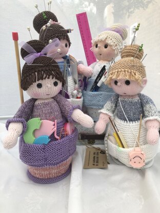 MISS TILLY TIDY is just the companion you need to help you keep your bits and pieces tidy while you work. She can be used as knitting or crochet companion, desk tidy or kitchen helper. She has two deep pockets and three small. Just the right sizes to hold knitting needles, crochet hooks, small scissors, cottons and threads, stitch holders and markers, tape measures, pens and pencils. the list is endless. Her chić hairstyle is also a pincushion to hold your pins and sewing needles safely.