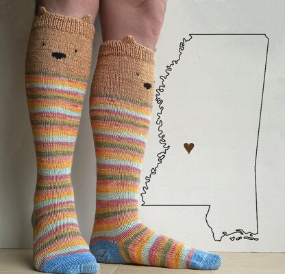Mississippi calls to mind bluegrass, catfish, the grand Mississippi River, and Magnolias. In 1902, President Theodore Roosevelt refused to kill a bear while on a hunting trip in Mississippi. The ensuing newspaper narratives led to the creating of the “Teddy Bear”. This sock features a simple bear face over wild stripes.
