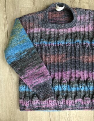 A beautifully intriguing alternating leaf pattern adorns the front and back of this design. The central main pattern adds flattering verticals. The sleeves are in stocking stitch and finished off with very pretty rib and garter stitch ridged cuffs. The very lightweight Rico Aran yarn makes this a joy to wear.