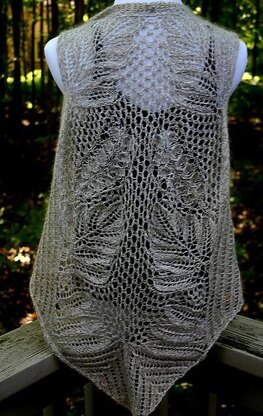 Vest is knit in one piece with shoulders seamed at finish. A beaded front angles down to a long pointed back. Sizing is accomplished through the repeated stitches to the side of the lace panels. This pattern has 12 charts and uses short rows for shaping.