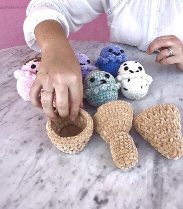 Materials: Cone - about 30 grams of Big Twist Baby Bear in Toffee * Scoop - about 40 grams of Big Twist Baby Bear in assorted colors * crochet hook - 4.5 mm fiberfill stuffing yarn needle stitch marker 12 mm safety eyes (or you can embroider with your choice of yarn or thread)