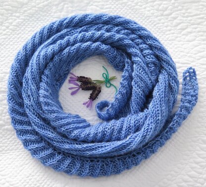 An elongated boomerang shape with eyelet edges, this scarf has the effect of being knitted on the bias but the main feature is the chunky and at the same time lacy, purl-less rib.