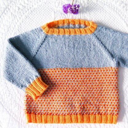 This topdown circular seamless baby pullover is made with three colour yarns & the lower part of the body is the linen technique, simply alternating knit stitch & slipped stitch with the yarn in front. This technique tightens up the stitches very significantly, so we have to change to much larger than usual needles for that part of the body.