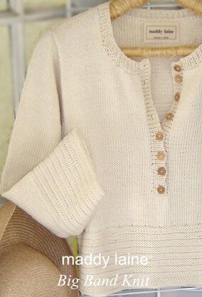 A maddy laine knitting pattern for a classic pullover with wide bands of horizontal ribbing that sit at the waist and also edge the three-quarter length sleeves. The pattern design features a long front-buttoned opening and set-in sleeves to knit in DK yarn.