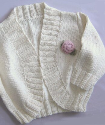 A maddy kids pattern for an easy-to-knit cardigan for little girls. This sweater has three-quarter sleeves and a knitted flower - perfect to shrug on little shoulders.